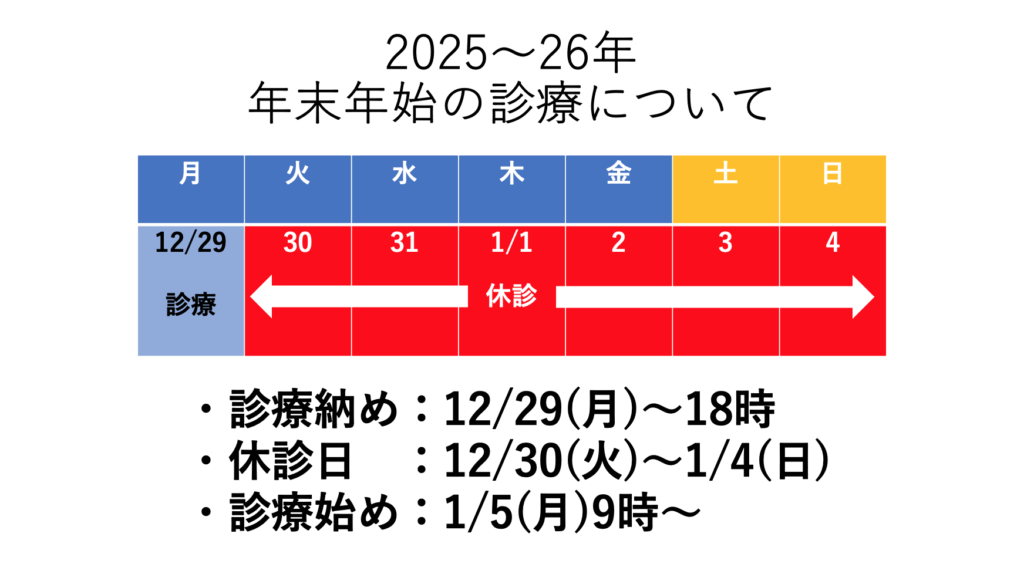 2025.11.30 お知らせ ・診療納め:12/29(月)〜18時・休診日:12/30(火)〜1/4(日)・診療始め:1/5(月)9時〜 ご不便をおかけしますが、ご理解のほどよろしくお願い申し上げます。